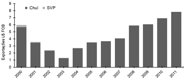 A análise dos dados das operações de exportação dos municípios de Santa Vitória do Palmar e Chuí revela uma transformação econômica profunda ao longo dos últimos anos, marcada pela inversão do protagonismo regional e por uma mudança radical na matriz produtiva. Entre os anos de 2000 e 2011, o cenário era dominado pelo município do Chuí, que detinha 91,4% das exportações da região, enquanto Santa Vitória do Palmar participava com apenas 8,6%. Nesse período, a pauta exportadora era diversificada e focada em manufaturados e processados, com destaque para móveis e suas partes, que representavam 8,7% do total, seguidos por álcool etílico e madeira serrada, ambos com 6,5%, além de produtos de confeitaria e ladrilhos. Em termos financeiros, as exportações líquidas apresentaram um crescimento gradual, saindo de 5,5 milhões de dólares em 2000 para um pico de 7,3 milhões em 2011.