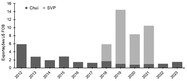 O cenário começou a mudar drasticamente no período compreendido entre 2012 e 2023, momento em que Santa Vitória do Palmar assumiu a liderança regional, passando a responder por 60,2% das exportações, contra 39,8% do Chuí. Essa fase de transição foi caracterizada por uma forte concentração em produtos químicos e resinosos, especificamente goma-laca e resinas, que sozinhos compuseram 59,81% da pauta exportadora, deixando para trás itens como madeira serrada, papel higiênico e batatas, que tiveram participações menores. Financeiramente, este período registrou uma volatilidade significativa, atingindo um recorde isolado de 33 milhões de dólares em 2015, mas sofrendo quedas acentuadas nos anos subsequentes, chegando a valores próximos de 1 milhão entre 2022 e 2023.