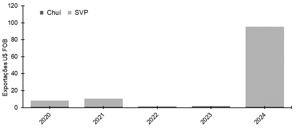 Atualmente, observando os dados de 2024 e as projeções para 2025, a região consolidou-se como um polo de commodities agrícolas, com uma hegemonia quase total de Santa Vitória do Palmar, que agora concentra 99,2% das exportações, reduzindo a participação do Chuí a insignificantes 0,8%. A matriz de produtos foi quase completamente substituída pela presença de um único produto, onde a soja domina 94,25% das exportações, seguida pelo trigo com 4,73%. Essa virada para a agricultura em larga escala resultou em uma explosão nos valores transacionados, elevando o patamar econômico da região para níveis inéditos: as exportações, que antes estavam na casa dos 7 milhões, aproximaram-se de 95 milhões de dólares em 2024 e têm projeção de ultrapassar a barreira dos 100 milhões de dólares em 2025.