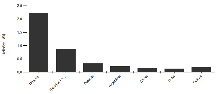 No início dos anos 2000, as operações de importações realizadas pelos dois municípios estavam fortemente concentradas no Uruguai, que representava 54% do total entre 2000 e 2011. A proximidade geográfica e os laços históricos entre as fronteiras explicam essa predominância. Nesse mesmo período, Estados Unidos (21%) e Polônia (8%) também marcaram presença, ainda que de forma secundária - ver gráfico abaixo.