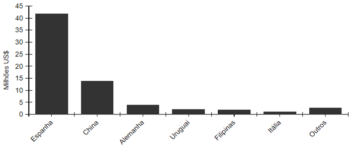 Com o passar dos anos, o cenário se diversificou. Entre 2012 e 2023, a Espanha assumiu a liderança, respondendo por 62% das operações de importações. Esse movimento indica uma abertura maior para o comércio europeu, acompanhada pelo crescimento da China que de (4%) passou para (21%), consolidando a presença asiática nas transações locais - ver gráfico a seguir.