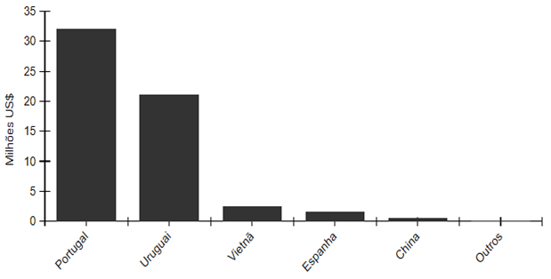No período 2012–2023, o panorama muda: Portugal torna-se o principal destino das operações de exportações (55%), seguido pelo Uruguai (36%). Essa nova configuração revela a expansão das fronteiras comerciais para além da América do Sul, com a Europa ganhando papel de destaque - ver gráfico a seguir.